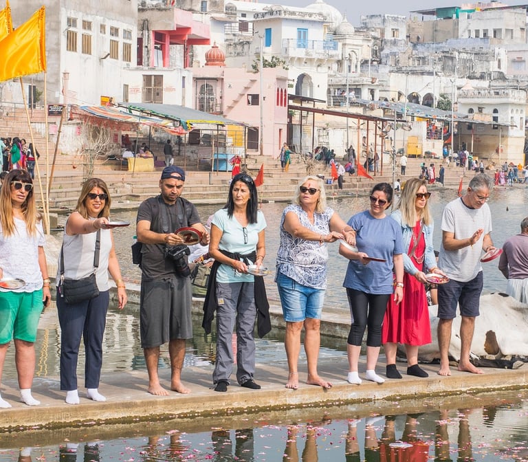 Später fahren Sie weiter nach Pushkar. Das Ufer des heiligen Sees von Pushkar wird von 52 verschiedenen Ghats, den Badetreppen der Hindus, gesäumt. Dieser See ist seit alter Zeit ein wichtiger Rastplatz der zwischen dem Nahen Osten und Zentralasien verkehrenden Karawanen gewesen, bis im Mittelalter die Brahmanen an seinen Ufern einen Tempel zu Ehren der Gottheit Brahma errichten ließen, den einzigen im ganzen Land. Seitdem gehört Pushkar zu den wichtigsten Pilgerorten des Hinduismus. Unzählige von Pilgern vollziehen im See rituelle Bäder und Waschungen. Pushkar ist jedes Jahr Ende November Schauplatz für den bunten Kamelmarkt Pushkar Mela. Auf der Fahrt halten Sie bei der islamischen Pilgerstätte Ajmer, wo Sie den Khwaja Gharib Nawaz Schrein mit dem Grabmal vom Mystiker Muinuddin Chishti sehen.